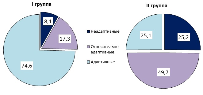 При детализации выбора копинг-когниций установлено, что среди адаптивных копинг-реакций в I группе в равной степени предпочтение отдавалось проблемному анализу и сохранению самообладания (по 40,0%, соответственно), а в структуре неадаптивных копинг-форм во II группе превалировала растерянность (50,3%).