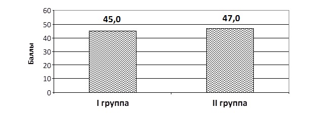 Рис. 1. Распределение уровней личностной тревожности в баллах у лиц I и II групп