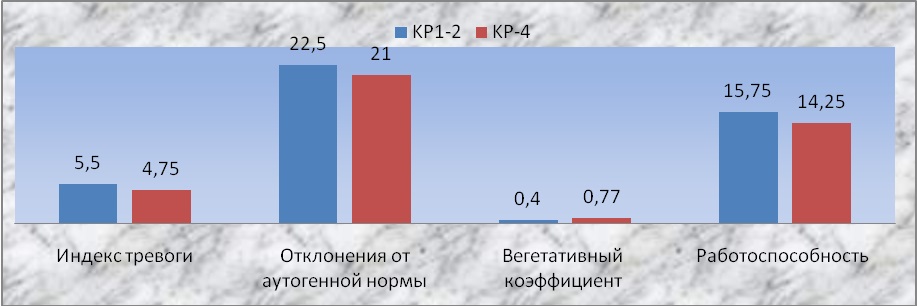Психологическое состояние. Психологическое персонифицированное невербальное тестирование с использованием теста Люшера, отражающего эмоционально-характериологический базис личности, позволило установить у всех женщин достаточно высокую напряженность и повышенную раздражительность (индекс отклонения от аутогенной нормы) как в относительно спокойные дни, так и в дни с возмущенной геомагнитной обстановкой (соответственно 22,5 и 21,0,при норме 0-8 баллов). Наряду с этим у подавляющего большинства отмечались сниженная работоспособность (Кр=1-2 – 15,75 и Кр=4 – 14,25 при норме 6-9 баллов), высокий индекс тревоги (Кр=1-2 – 5,5 и Кр=4 – 4,75 при норме 0-3 балла) и снижение вегетативного тонуса (Кр=1-2 – 0,4 и Кр=4 – 0,77 при норме 1,0-1,5 балла), не зависящие от геомагнитной обстановки (Рис.1). Поэтому вклад психологического состояния в результаты исследований можно считать сопоставимым с уровнем индивидуальных шумов.