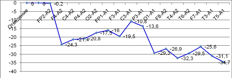 Примечание: по оси абсцисс – корковые области (отведения) обоих полушарий, по оси ординат – величина, выраженная в виде разницы между значениями индекса тета-ритма в дни геомагнитного возмущения и в дни спокойной геомагнитной обстановки. На линии в точках отведений отмечена величина разницы между тета-индексами.