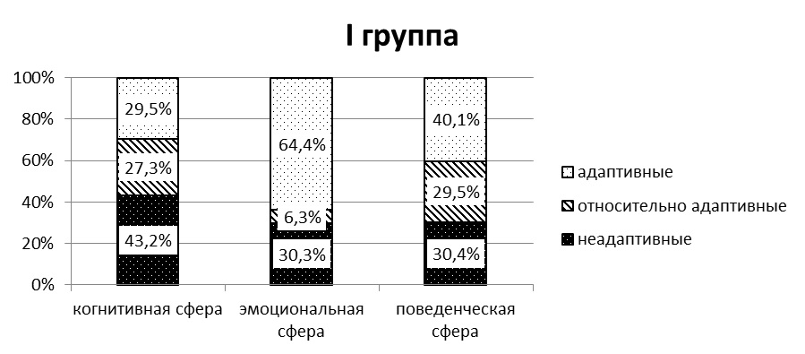 Как видно из данных, представленных на рис.3, в когнитивной сфере стресс-преодолевающего поведения представители I группы (без ИМ в анамнезе) чаще выбирали неадаптивные и реже – адаптивные когниции, чем пациенты из II группы (имеющие ИМ в анамнезе).