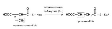 Другим ферментом, в состав которого входит активная форма В12 является метилмалонил-КоА-мутаза, которая принимает участие в переходе метилмалонил-КоА в сукцинил-КоА (рис. 3).