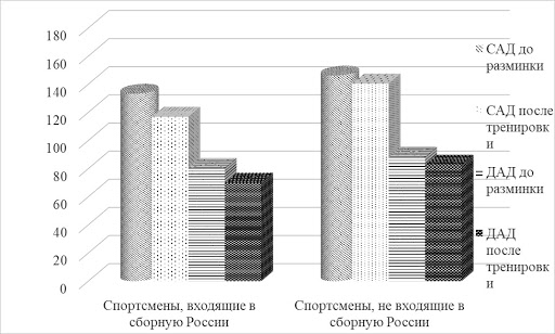 Спортсмены-ветераны, которые более успешно выступают на соревнованиях разного уровня и по рейтингу попадают в сборную команду РФ, имеют достоверно более низкие средние значения САД и ДАД как до, так и после и тренировочных, и соревновательных нагрузок (рис. 1).