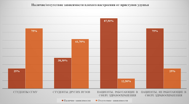 1) Чувство подавленности у студентов различных ВУЗов и у неработающих респондентов в здравоохранении проявлялось гораздо чаще, чем у работающих в здравоохранении респондентов и студентов СГМУ, но, тем не менее, подавленность иногда наблюдалось у респондентов, относящихся к сфере медицины, что, скорее всего, связано с более глубокими знаниями клинической картины заболевания и профилактики приступов удушья.