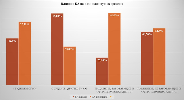 В вопросе по влиянию астмы на возникновение депрессий, по словам респондентов, были получены следующие результаты: большинство студентов Саратовского ГМУ им. В.И. Разумовского Минздрава России, и пациентов, относящихся к системе здравоохранения, отметили отсутствие влияния Бронхиальной астмы (БА) на возникающие у них депрессии, тогда как люди, не связанные с медициной отмечали обратное в большинстве случаев (рис. 6).
