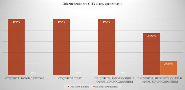 13-14 сентября 2020г. был произведен экспресс-опрос, касательно вопроса обеспеченности СИЗ и дез. средствами, основываясь на приказе «О выдаче средств индивидуальной защиты в период распространения коронавирусной инфекции». Студенты ВУЗов г. Саратова в превалирующем большинстве получали маски и дез. средства. Но, если учитывать показатели опроса респондентов аллергоцентра, следует отметить, что пациенты с диагнозом бронхиальная астма, работающие в сфере здравоохранения получали в полной мере СИЗ, то пациенты, работающие на различные частные и государственные учреждения города Саратова, обеспечивались СИЗ недостаточно, а именно, получающих СИЗ ставило большинство, однако четверть респондентов ответило, что не были обеспечены СИЗ в полной мере (рис. 9).