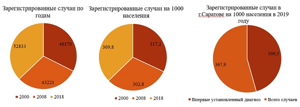 Примечание: 1) Зарегистрированные случаи по годам: 2000, 2008, 2018. 2) Зарегистрированные случаи на 1000 населения по годам: 2000, 2008, 2018. 3) Зарегистрированные случаи в г. Саратове на 1000 населения в 2019 году