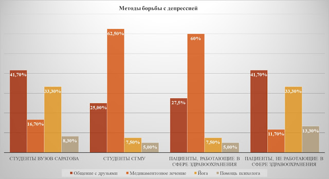 Проанализировав данные по методам борьбы с депрессиями, были получены следующие результаты: большинство респондентов подавляет депрессию с помощью медикаментозной терапии, в особенности студенты СГМУ им. В.И. Разумовского и пациенты, страдающие от бронхиальной астмы, работающие в сфере здравоохранения, а люди, не имеющие связи с медициной, предпочитают медикаментозному лечению занятия йогой и общение с друзьями, и иногда прибегают к помощи психолога (рис. 7).