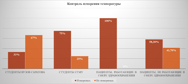 Далее, рассматривая вопрос об измерении температуры в организациях, согласно приказу Министерства здравоохранения РФ от 19 марта 2020 г. № 198н "О временном порядке организации работы медицинских организаций в целях реализации мер по профилактике и снижению рисков распространения новой коронавирусной инфекции COVID-19" отметим следующую динамику: большинству респондентам СГМУ им. В.И. Разумовского производилось измерение температуры в корпусах, тогда как у других ВУЗов г. Саратова наблюдалась следующая картина: 20 человек из 60 ответило, что им измеряют температуру, тогда как большинство ответило обратное. Ситуация по опросам пациентов Аллергоцентра была похожей по оснащению средствами защиты. А именно работники сферы здравоохранения в 100 процентах случаев проводили измерение температуры согласно приказам, но, стоит отметить, что у респондентов, не работающих сложилась иная ситуация: большинству респондентам производили измерение температуры (рис. 10).
