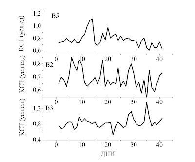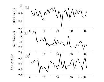 На следующем этапе обработки результатов для каждого из 6-и добровольцев (В1 – В6) были построены графики изменения КСТ за весь период наблюдения (рис.1, рис.2), позволяющие оценить динамику колебаний показателя во время мониторинга. Как видно из рисунков, КСТ добровольцев существенно менялись из дня в день, что подтверждает целесообразность именно динамического наблюдения в течение длительного времени для получения достоверных сведений о состоянии сердечно-сосудистой системы обследуемых. Однократное измерение показателей фазового портрета ЭКГ не позволило бы получить полноценную информацию о состоянии миокарда врачей-добровольцев, поскольку отличия в показателях КСТ во время мониторинга в различные дни были достаточно большими. Напри-мер, у добровольца В1 (рис.1) на 22-й день мониторинга зарегистрирован КСТ 0,95 усл. ед., на 23-й день произошло резкое снижение до 0,71 усл.ед., а на 24-й – резкое повышение вновь до 0,93 усл. ед. Аналогичные колебания КСТ, выявленные у всех участников иссле-дования, свидетельствуют, что процессы электрогенеза миокарда у здоровых лиц находятся в состоянии динамического равновесия и для представления о состоянии процессов реполя-ризации миокарда желудочков необходим сбор информации в течение длительного времени.